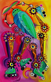 Each painting of the series was created with the dimensions of a cell phone in mind. Fools Parade is bright, whimsical and seductive in nature born out of the dissection of an “old” iPhone, technology inspired geometrical shapes can be found within the paintings. At first glance, the work is playful and innocent. The electric colours and unconventional shapes create an enticing visual. The viewer is flooded with a bombardment of abstract imagery that is nonsensical in nature. A drunken, awe struck, trancelike state arrises within the viewer. The audience, unbeknownst, as if lost in the cyber world, is utterly captivated by the lustrous paintings.